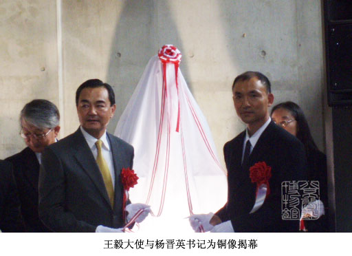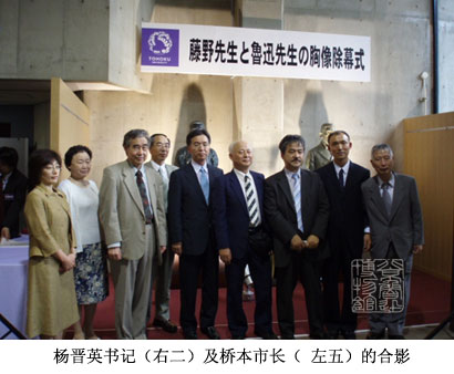 揭幕式举行之前,北京鲁迅博物馆杨晋英书记和芦原市桥本达也市长在东北大学百周年纪念事业室工作人员的陪同下,拜会了东北大学井上明久校长,并参观了当年鲁迅学习解剖学课程的阶梯教室。仪式上,王毅大使、东北大学校长、杨晋英书记、仙台市与芦原市政府官员,以及鲁迅及藤野先生的后代等共同为铜像揭幕。王毅大使、杨晋英书记、桥本达也市长还分别致辞,对此次揭幕式的举行表达热烈祝贺。王毅大使指出,《藤野先生》一文一直被编入中国的中学教科书,很多中国人对日本人的了解便源于这篇脍炙人口的文章。藤野先生