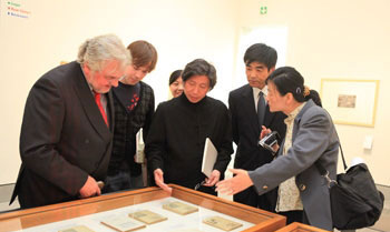 开幕式结束后,中国美术馆馆长范迪安、我馆副馆长赵国顺、上海鲁迅纪念馆副馆长王锡荣陪同根特市文化局局长Liven Decaluwe观看了整个展览。范迪安馆长向Liven Decaluwe局长详细介绍了鲁迅收藏的麦绥莱勒作品集。
