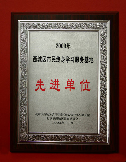 2009年11月,北京市西城区学习型城区建设领导小组办公室、北京市西城区教育委员会授予我馆“2009年西城区市民终身学习服务基地先进单位”。