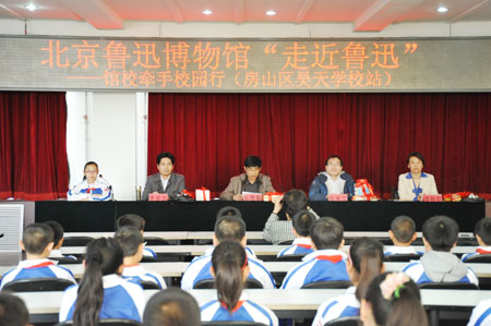 6月13日,我馆社教部在房山区良乡镇昊天学校举行了“‘走近鲁迅’馆校牵手校园行”房山站开幕式。馆党委副书记、副馆长赵国顺和社教部的有关人员以及房山区教育局社会大课堂办公室、房山区少年宫主任李京文、昊天学校校长李秋红等参加了活动。
