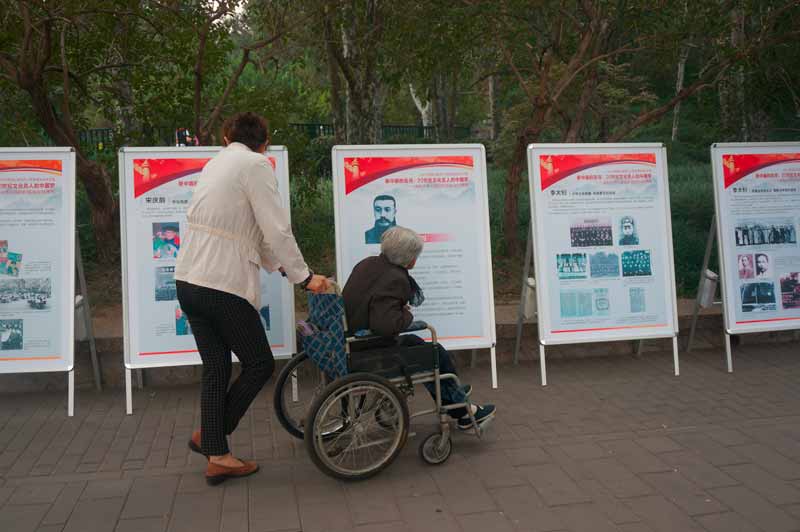 参观的人群逐渐增加,有的是坐着轮椅的老人。