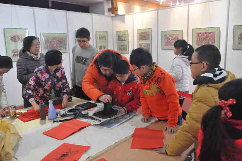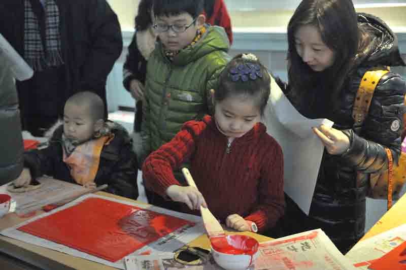2015年2月17日,在辞旧迎新之际,北京鲁迅博物馆(北京新文化运动纪念馆)举办了“看年画过大年”亲子文化教育活动?;疃谌葜饕校荷湍昊?、印年画、写福字、送春联、画脸谱、捏面人等,国家“非物质文化遗产?;は钅?rdquo;泥塑彩绘脸谱代表性传承人佟秀芬女士和中国民间工艺美术大师、面塑艺术家张宝琳先生的到来为此次活动增添了不少光彩,他们现场展示精湛技艺和优秀作品,教授孩子们捏面人、画脸谱。孩子们在老师的带领下,倾听老师讲述鲁迅故事和木刻运动、鲁迅和传统木板水印技艺,用传统木板水印拓印鲁迅藏外国版画名作模板,体验现代版画和古老的木板水印技艺交相辉映的魅力。