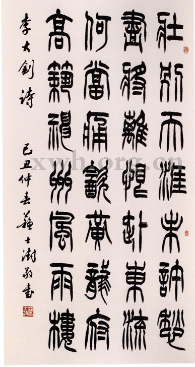 作者简介: 苏士澍 全国政协常委,中国书法家协会理事,中国书画收藏家协会会长。 作品名称:篆书李大钊诗 作品尺寸:198×99厘米