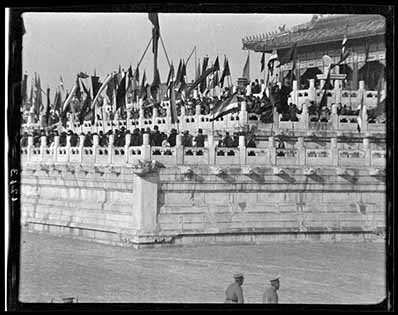 4、11月28日总统大阅兵北京政府方面决定于11月28日在紫禁城太和殿举行欧战胜利庆典,检阅各国军队。据记载,当天上午10点15分,中、英、美、法、比利时、日本、印度、安南等八国军队将近万人列队于太和殿下,等候检阅。同时,观礼群众和嘉宾在10点30前在太和殿集合,其中女宾在太和殿前二层台阶上东首集合,各国公使参赞等嘉宾在太和门集合。10点50分,总统徐世昌抵达太和门,等候在此的中外嘉宾随同总统巡阅中外部队。然后总统登上太和殿,美、日、英、法、比、中各国官兵分两行手持国旗登上太和殿。总统向各国国旗鞠躬致敬,并发表致词。致词结束,总统与各军官行握手礼后退入中和殿。捧旗官兵由西边台阶归队,中外军队列队出天安门。当天还有南苑航空学校飞艇两艘,在空中回翔,抛下各国国旗。同时有军用鸽数百只飞鸣空中。中外男女来宾参观者多至数千人。[6]