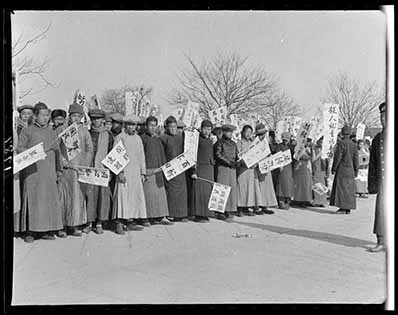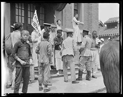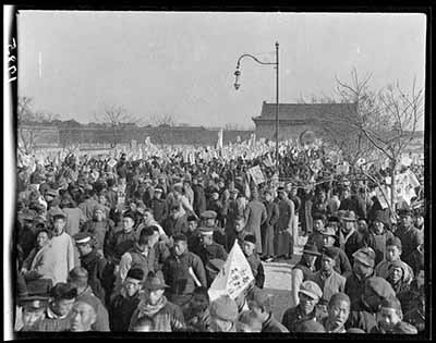 4、总统府前抗议甘博有3张照片记录了6月28日的请愿活动。据报载,6月27日下午1点左右,山东请愿团、北京中等以上学校学生联合会代表请愿团、京师总商会、在京的留日学生、报界、基督教、陕西学生联合会等各界人士四五百人,手执旗帜,来到总统府(新华门)请愿。各界推出代表7人,向总统提出“不要在欧洲和约签字”等三项要求。但从中午到下午,一直未得到总统接见。晚上11点,代理内阁总理龚心湛才接见各界代表,他表示会向总统汇报,劝各代表散去,但各代表坚持表示要见总统,于是代表留宿颐年堂,其余请愿人员,主要为学生,露宿于新华门外。直到次日上午9时,总统徐世昌才接见了请愿团代表,表示已电令外交总长陆征祥切实保留山东权利,否则不签字,谈话进行了将近两小时,在得到龚声明政府定竭尽全力后代表才出来向学生报告。但学生仍未散去。此时天津代表赶到北京,与北京代表合在一处。当晚六点徐世昌接见天津代表,再次表示山东问题持保留主义,座谈一小时,代表始出。到晚上八点,所有代表和学生才散去。[11]当时媒体报道请愿学生有150余人,包括两名女生,他们在新华门前停留三十个小时,仅食面包及汽水少许。[12]