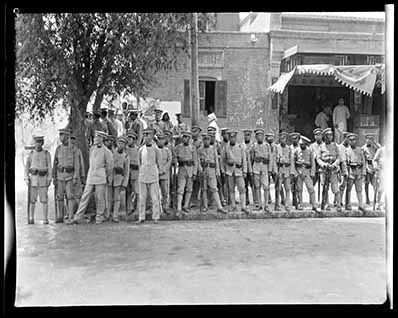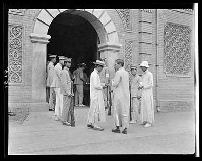 据甘博的记述,从5日的晚上起,政府就向学生表示屈服,撤销了对北大法科的守卫,但是学生并不肯离开。他们还在临时监禁处成立几个委员会,其中一个负责法科门口的治安。如果没有正当理由的话,所有学生不能离开这里,访客也不能进来。所有访客被要求告知姓名、住址、事由,才能发给一个通行证,进入法科校园。进去之后需要由一个专门的人陪同去找学生的领导再拿一个通行证才能离开。这组照片中有两张照片拍摄地点为北大法科门口,既有持枪的军警,也有带礼帽、穿长衫的学生,这些学生可能就是负责维持治安的(图23)。