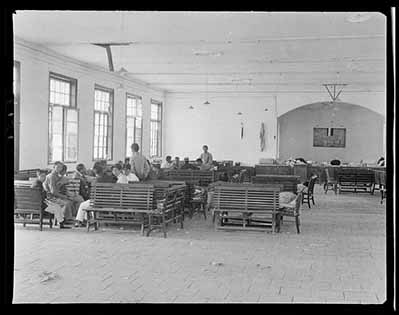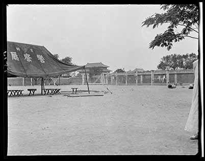 3、临时监狱情况学生被监禁后,遭到社会各界严正抗议。他们认为学生如犯罪可依法处置,但大学则为国家机关,不能无故占领作为囹圄,受到非法侵犯。此外,民众最关心的就是学生在监狱的生活,尤其是吃饭睡觉问题。据报载,京师警察厅开始没有为如此多的学生准备饮食。监禁第一日,学生们只能食粥一碗。各校教职员不忍学生挨饿,捐款购买馒头、面包送给学生。学生因饥饿而病者不乏其人。后京师警察厅请各校为学生准备食物,才有十余车面包运到北大法科。学生有被褥铺盖,是家属送来的。[10]甘博拍摄了学生临时监禁处北大法科内、外部照片7张,包括北大法科的食堂、大讲堂、教室、操场等(图20-22)。可以看到学生们睡在由桌椅组成的临时床铺上,可读书看报,自由活动。