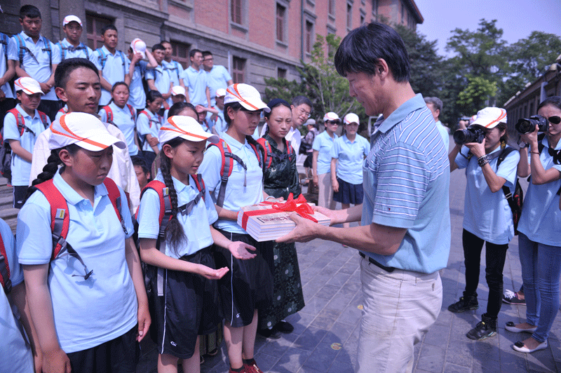 下午2时左右,杂多县中学生“三爱”教育访京团抵达后,参加此次活动的各级领导、老师、学生和工作人员在北大红楼前集体合影留念。接着举行了北京鲁迅博物馆(北京新文化运动纪念馆)向杂多县中学生赠书仪式活动,副馆长何洪同志向5名中学生代表赠送了五四新文化运动展览图录《新时代的先声》60套;5名藏族中学生向北京鲁迅博物馆(北京新文化运动纪念馆)5名领导、工作人员敬献了哈达,以示感谢;何洪副馆长、王云泽部长、朱铁志副总编辑先后致欢迎辞、答谢辞和讲话,活动现场多次响起阵阵掌声,营造了深厚的学习实践活动氛围。