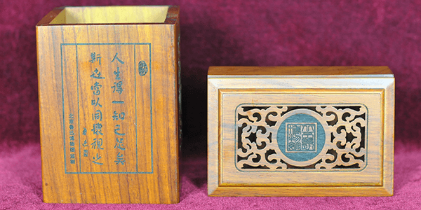 笔筒及名片盒采用优质花梨木制作,笔筒一面雕刻鲁迅录清代何瓦琴名手稿“人生得一知已足矣,斯世当以同怀视之”,一面为鲁迅博物馆印章,另两面为镂空雕刻吉祥花纹图案。名片盒上面雕刻有鲁迅博物馆印章。此产品置于文案高雅大气,为文人礼品中之佳品。此产品为北京鲁迅博物馆监制。