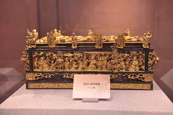 《漆金人物馔食盒》此器为清代福建民间祭祀用品。果盒周身镂雕100多个三国人物,构图饱满,人物形象,眉须毕现。四周浮雕龙柱,盘龙双目炯炯放光,张口咧呀,触须飘动,形象灵动,呼之欲出。果盒底部则雕刻金漆花卉卷草纹,寓意吉祥富贵。此器雕刻细腻,玲珑剔透,金漆完好,尽显豪华,用于妈祖庙中盛放祭祀干果,足见清代福建经济的繁盛与妈祖信仰的盛行。