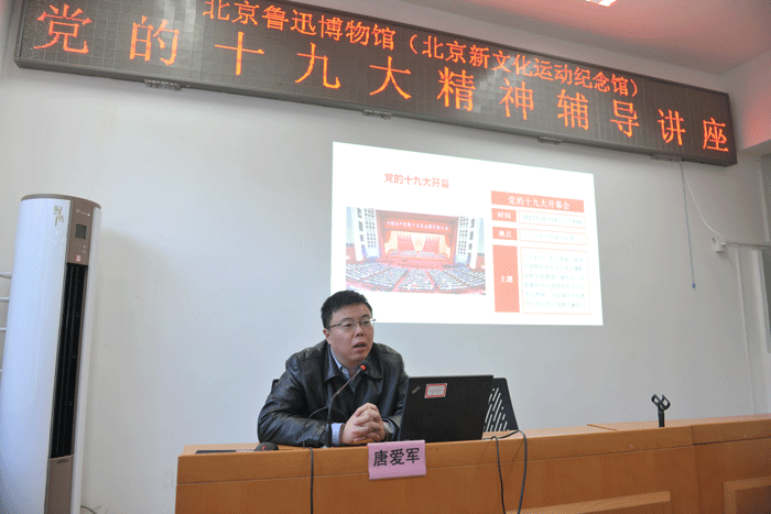 为深入学习宣传贯彻党的十九大精神,积极推进区域化党建工作,12月8日下午,北京鲁迅博物馆(北京新文化运动纪念馆)联合西城区新街口街道办事处宫门口社区、北顺社区开展了一次特殊党日活动,邀请中共中央党校马克思主义学院副教授唐爱军来我馆作党的十九大精神辅导讲座。我馆全体党员干部职工及两个社区的党员代表80余人参加了此次活动。唐爱军同志以“夺取新时代中国特色社会主义伟大胜利——十九大报告精神解读”为题,从十九大报告“四梁八柱”、中国特色社会主义新时代、中国特色社会主义新思想和中国特色社会主义新行动纲领4个方面作了详细解读,使大家对党的十九大精神有了更全面的理解,更加坚定了学习宣传贯彻党的十九大精神的信心和决心。宫门口社区和北顺社区的党员表示通过专家辅导讲座的形式可以更好地理解消化吸收党的十九大精神,并希望以后能有更多的机会参与到其中。