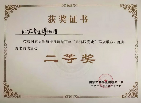 北京鲁迅博物馆(北京新文化运动纪念馆)在国家文物局“永远跟党走”群众歌咏、经典好书诵读活动中荣获二等奖