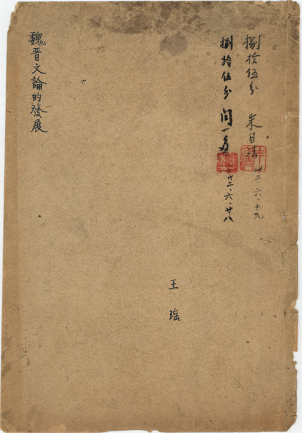 王瑶学位论文《魏晋文论的发展》封面,有朱自清、闻一多的打分